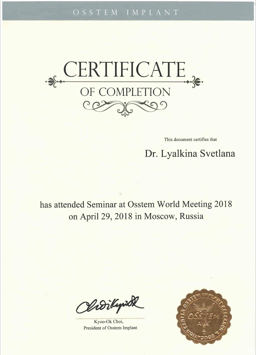 2018-Сертификат has attended Seminar at Osstem World Meeting